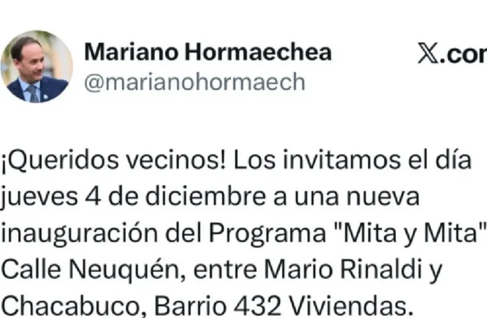 “Queridos vecinos, los invitamos cordialmente a acompañarnos este jueves 4 de diciembre en una nueva inauguración del programa ‘Mita y Mita’. La obra se encuentra en calle Neuquén, entre Mario Rinaldi y Chacabuco, en el barrio 432 Viviendas. Los esperamos a las 20 horas para celebrar juntos otro avance importante para nuestra comunidad”, expresó el mandatario local, animando a todos a participar de este encuentro que busca reafirmar el sentido de pertenencia y el espíritu de colaboración en Goya.