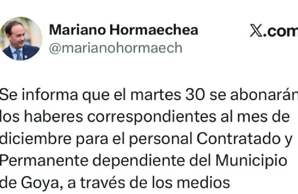 La Municipalidad de Goya confirmó el pago de los haberes correspondientes al mes de diciembre para todo su personal. El anuncio fue realizado por el intendente Mariano Hormaechea a través de sus canales oficiales, donde informó que este martes 30 de diciembre de 2025 se hará efectivo el depósito de los sueldos destinados tanto a los empleados de planta permanente como a los trabajadores contratados que dependen del municipio.