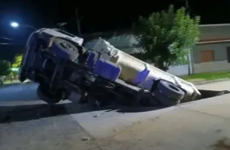 Un insólito y preocupante episodio se registró en la ciudad de Goya, donde un camión perteneciente al municipio terminó hundiéndose de manera repentina en plena calzada, en la intersección de las calles Uruguay y José María Soto. El hecho generó sorpresa entre vecinos y transeúntes, ya que el pavimento cedió sin previo aviso mientras el vehículo circulaba por la zona, quedando parcialmente atrapado en un profundo hundimiento del asfalto.